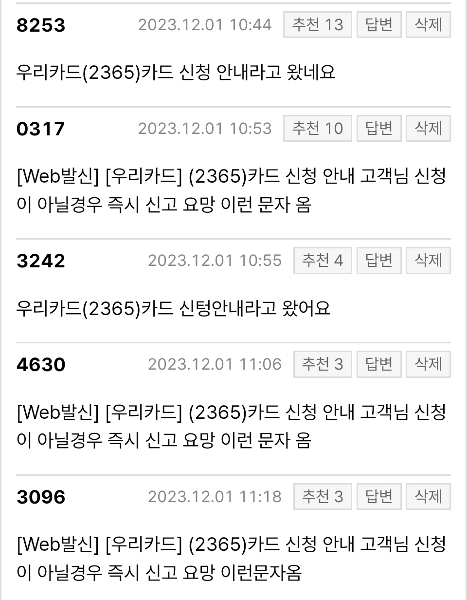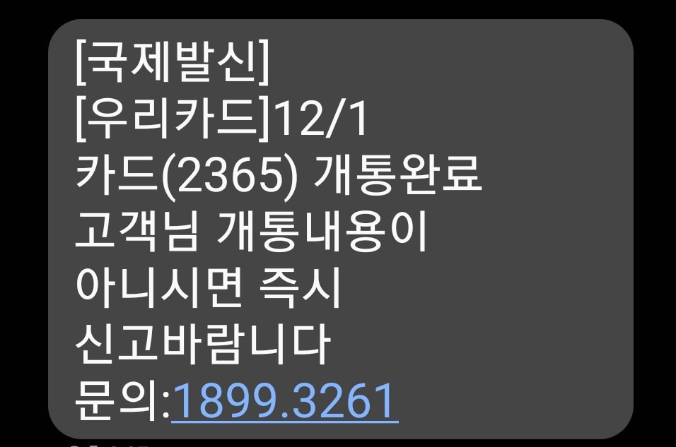 특히 주목할 만한 것은 우리카드를 사칭한 스팸문자입니다. 이 문자는 우리카드 신청과 관련된 내용을 담고 있으며, 문의를 원하면 18993261로 전화하라고 안내합니다.