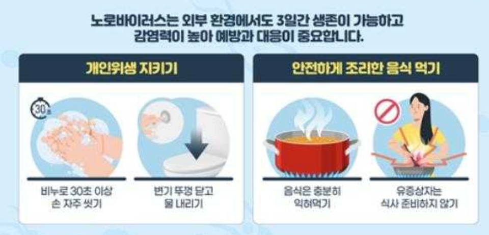 감염 환자는 증상이 사라진 후 48시간까지 등원, 등교, 출근을 자제해야 하며, 가족 간 공간 분리와 변기 뚜껑을 닫고 물을 내려 비말 전파를 막아야 합니다.