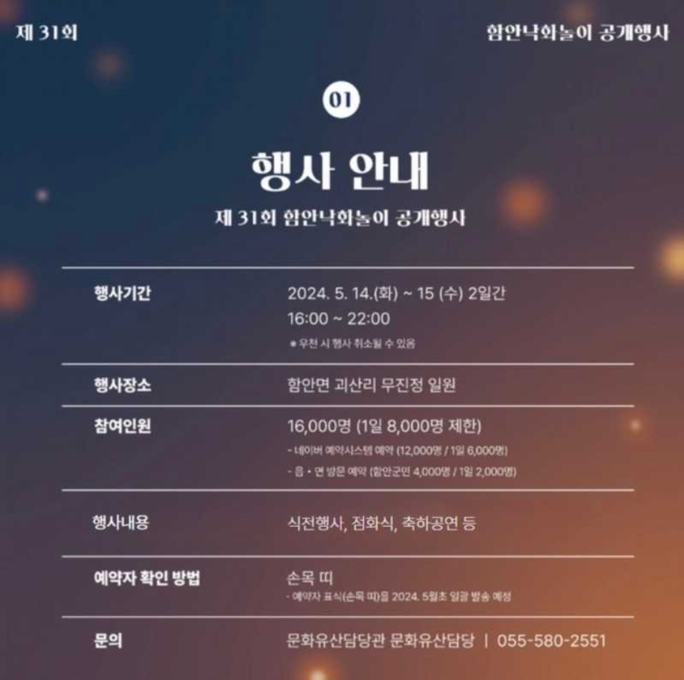 행사 참여를 희망하시는 분들은 인원 제한이 있으므로, 사전에 일정을 확인하고 준비해 주시기 바랍니다. 함안낙화놀이는 매년 많은 인기를 끌고 있으니, 미리 계획을 세우시는 것이 좋습니다.