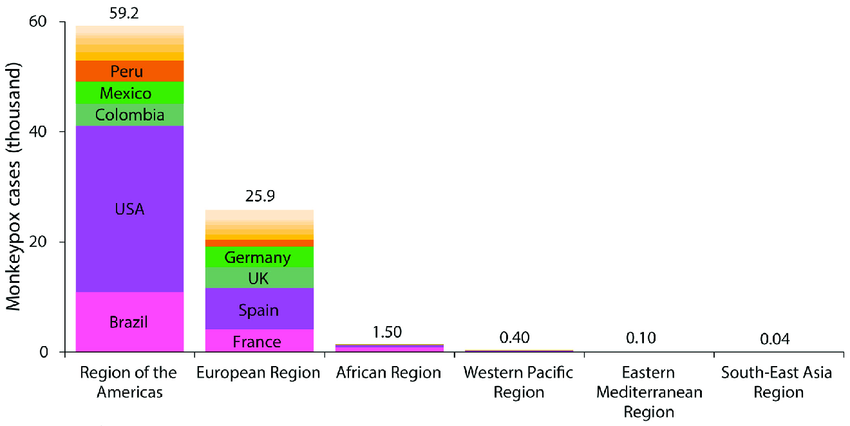 1. 아메리카 지역이 가장 많은 감염 사례를 보이며, 약 59,200건의 사례가 보고되었습니다. 이 지역에서는 미국, 브라질, 콜롬비아, 멕시코, 페루 순으로 많은 사례가 나타났습니다.
