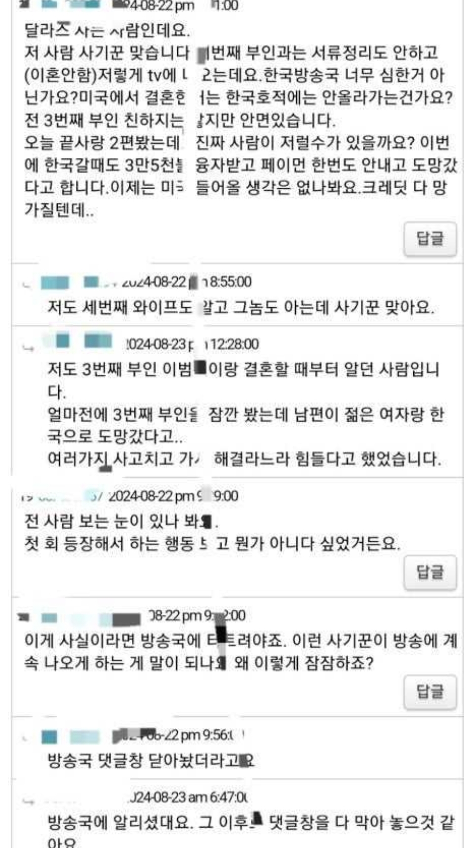 - "이범천은 한국에서 6년간 결혼 생활을 하다 미국으로 도망쳐 미혼인 척하며 사기 결혼을 했다."