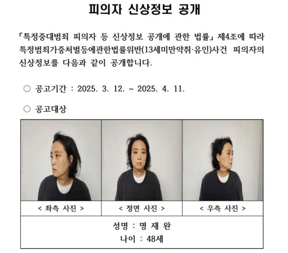 2025년 3월 12일, 대전경찰청은 초등학생 김하늘양을 살해한 혐의로 구속된 초등학교 교사 명재완(48)의 신상을 공개했다. 경찰은 전날 ‘신상정보 공개 심의위원회’를 개최해 범행의 잔인성, 피해 중대성, 유족의 의견 등을 종합적으로 고려한 결과, 이름과 나이, 얼굴 사진 등을 공개하기로 결정했다. 피의자인 명재완 역시 신상공개 결정에 이의가 없다는 의사를 밝혀 공개 절차가 진행되었다.