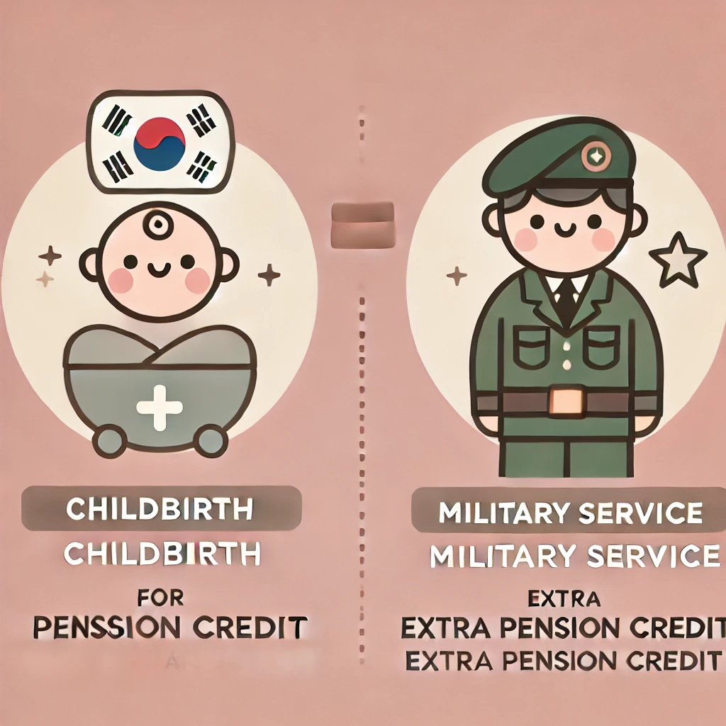 저출산 문제와 병역 의무 이행에 대한 보상 차원에서, 출산과 군복무에 대한 연금 크레딧이 확대됩니다. 첫째 자녀 출산 시 12개월의 추가 가입 기간이 인정되며, 군복무 기간은 최대 12개월까지 추가 가입 기간으로 산입됩니다.