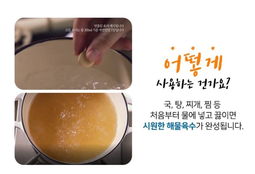 천연 재료로 만든 안전성만능고체육수는 육지와 바다에서 채취한 16가지 천연 재료로 제작됩니다. 이로 인해 인공 조미료나 화학 물질을 사용하지 않아, 안전하게 사용할 수 있습니다.