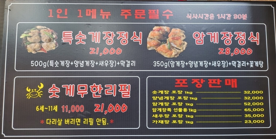 메인메뉴는 특게장정식과 숫게무한리필입니다.