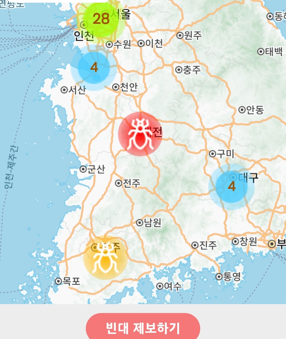 빈대맵은 국내 빈대 출몰 지역 현황을 알려주는 지도 서비스입니다. 빈대 추적 정보를 함께 공유하고 다함께 퇴치해요