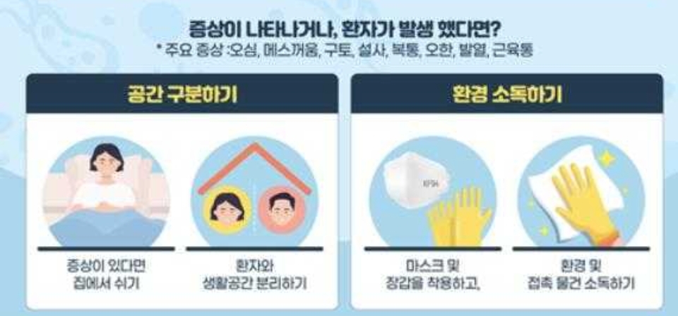 감염 환자는 증상이 사라진 후 48시간까지 등원, 등교, 출근을 자제해야 하며, 가족 간 공간 분리와 변기 뚜껑을 닫고 물을 내려 비말 전파를 막아야 합니다.