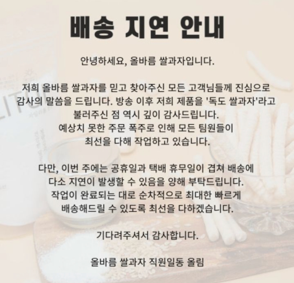 주문 폭주로 인해 배송이 지연될 수 있으므로, 가능한 한 빨리 주문하는 것이 중요합니다. 특히, 수요가 많은 제품이기 때문에 빠른 배송을 원한다면 추가 배송비를 지불하고 익일 배송을 선택하는 것도 하나의 방법입니다. 또한, 올바름 쌀과자의 경우 정식 판매처 외의 판매자를 통해 구매할 경우 가품이거나, 배송이 늦어질 수 있으니 이 점에 유의해야 합니다.