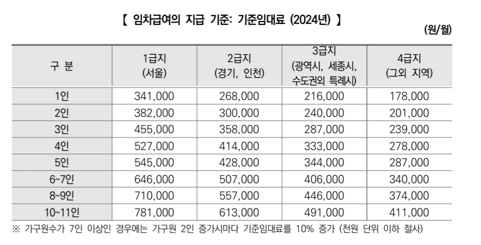 임차급여는 수급자의 소득인정액과 실제 임차료를 기준으로 산정됩니다. 임차급여의 기준임대료는 거주지의 지역과 가구원 수에 따라 달라지며, 수급자는 기준임대료와 실제 임차료 중 낮은 금액을 기준으로 임차급여를 받게 됩니다. 2024년 기준으로 설정된 기준임대료는 다음과 같습니다: