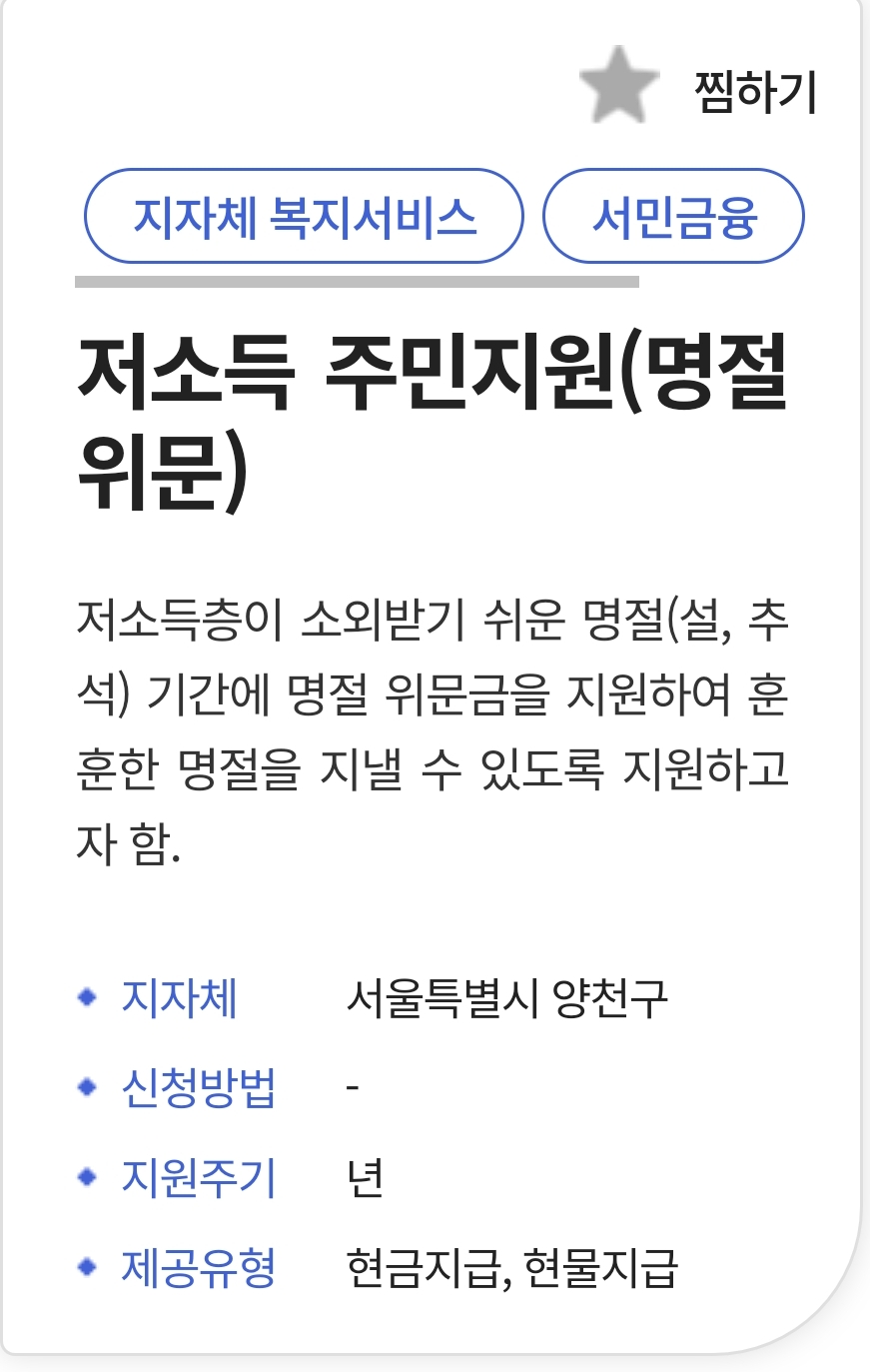 - 전남 구례군: 기초생활 수급자, 차상위계층, 한부모 가정 등에 선물세트 또는 상품권 지급
