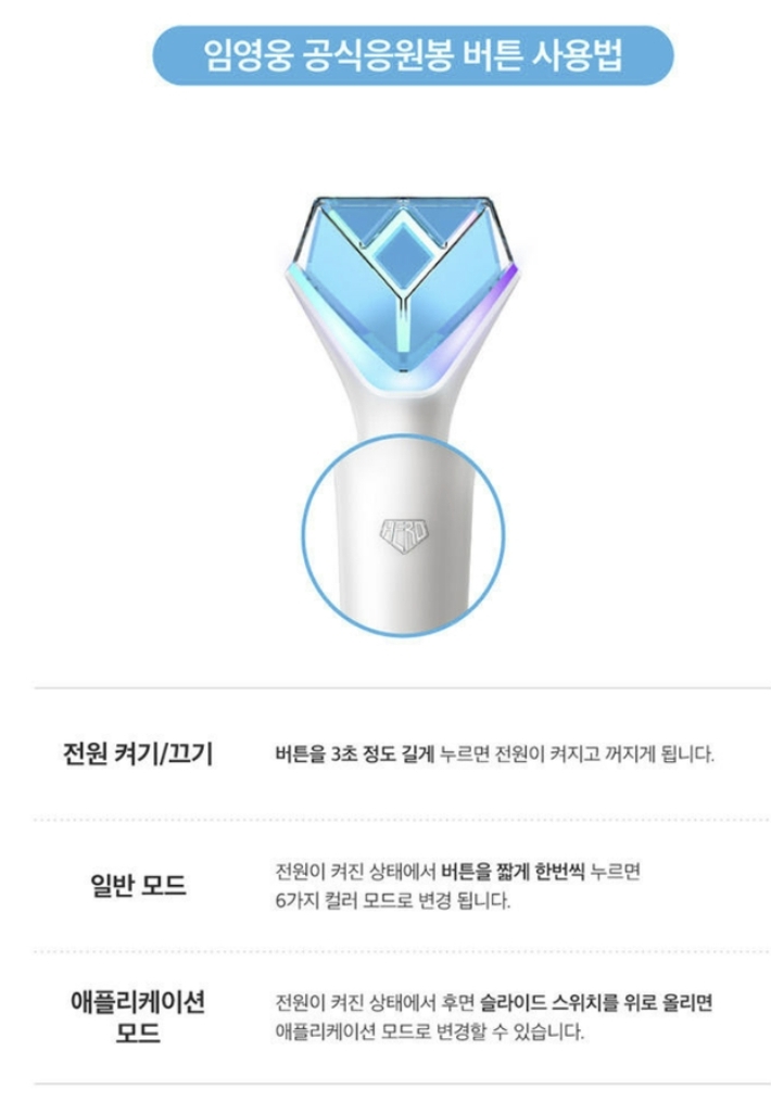 - 전원버튼: 응원봉의 전원버튼을 3~5초 정도 길게 누르면 파랑 빛을 내며 켜집니다.
