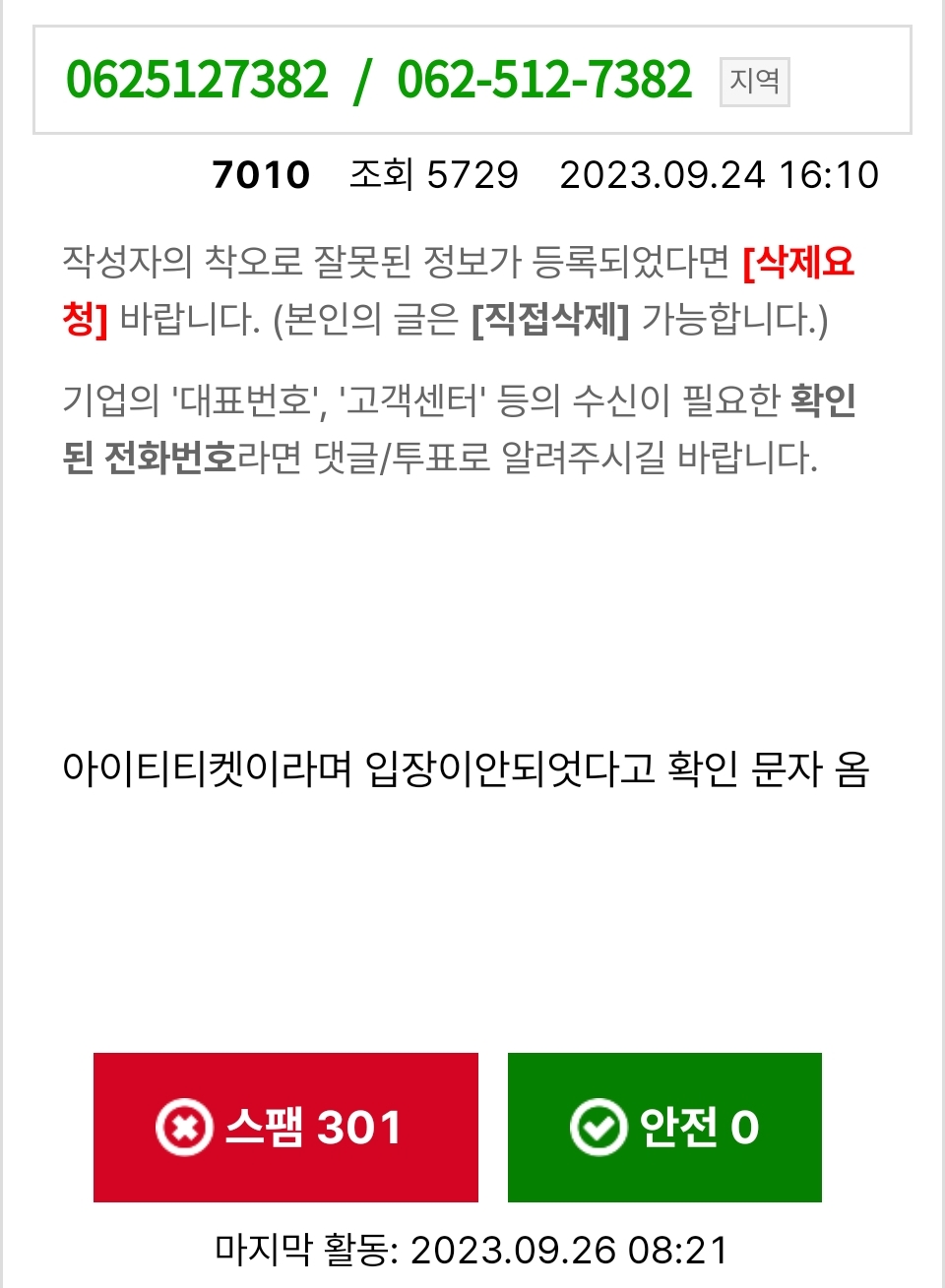 최근,062로 시작하는 발신번호로 "아이티티켓 입장안되셔서 다시한번 문자드립니다 확인바랍니다"라는 내용의 문자를 받은 사람들이 많습니다.