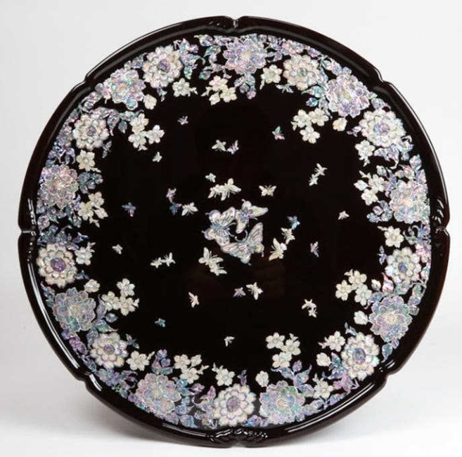 자개는 조개껍질을 얇게 가공하여 다양한 무늬를 표현하는 전통 기법이다. 이 자개상은 빛에 따라 오묘한 색감을 띠며, 블랙 바탕 위에 펼쳐진 조각 연화 문양이 고급스러움을 더한다.