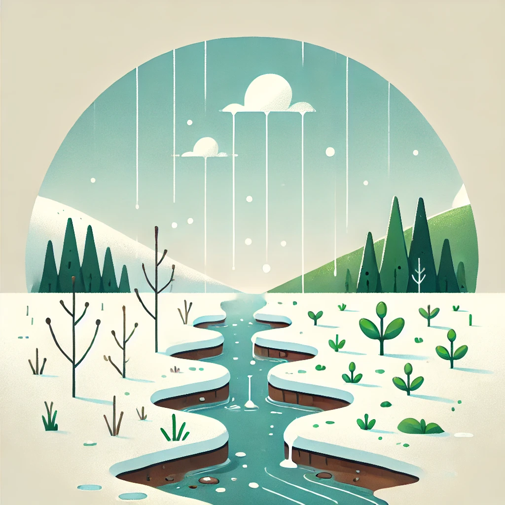 눈에서 비로: 겨울철 내린 눈이 녹아 물이 되고, 강과 개천에 흐르는 물이 많아진다.