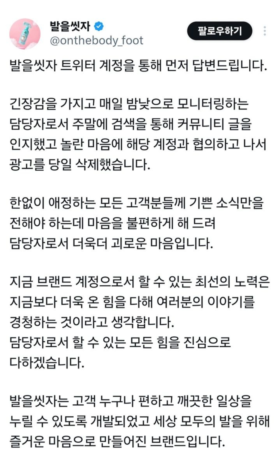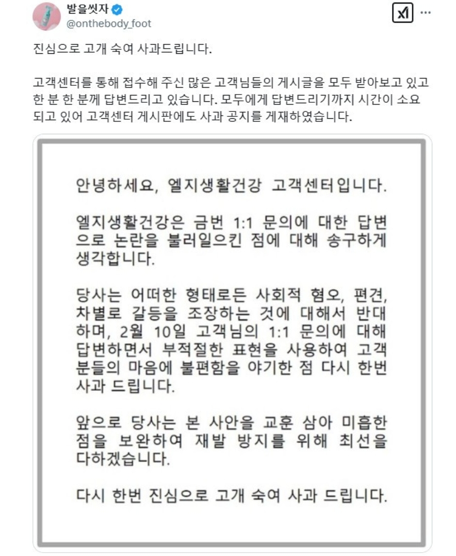 논란이 확산되자, LG생활건강은 '발을씻자' 공식 SNS 계정을 통해 사과문을 게시하였습니다.