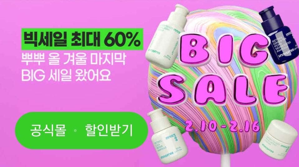 이니스프리는 2025년 2월 10일(월)부터 2월 16일(일)까지 총 7일간 최대 60% 할인 혜택을 제공하는 '2월 빅세일'을 진행합니다.