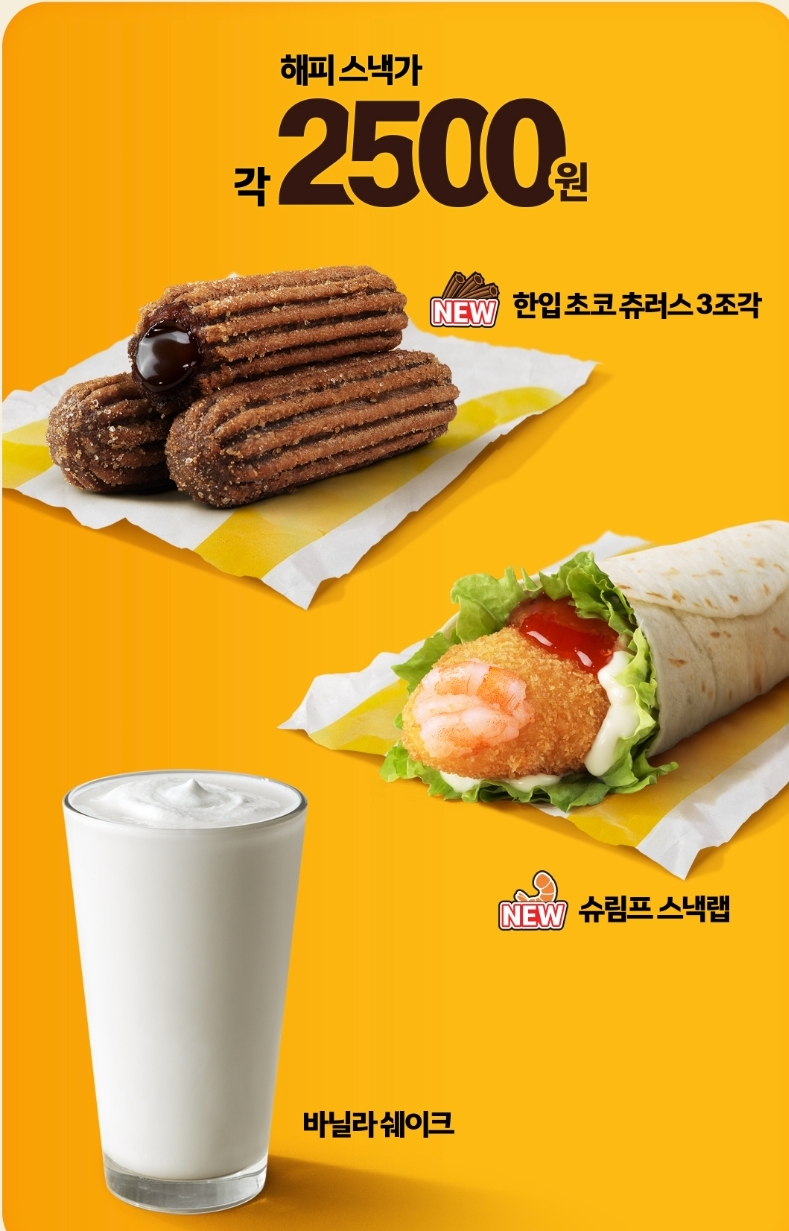바삭한 패티 속 탱글탱글한 새우살과 스위트 칠리 & 화이트 마요 소스가 어우러진 슈림프 스낵랩이 2,500원에 제공됩니다.