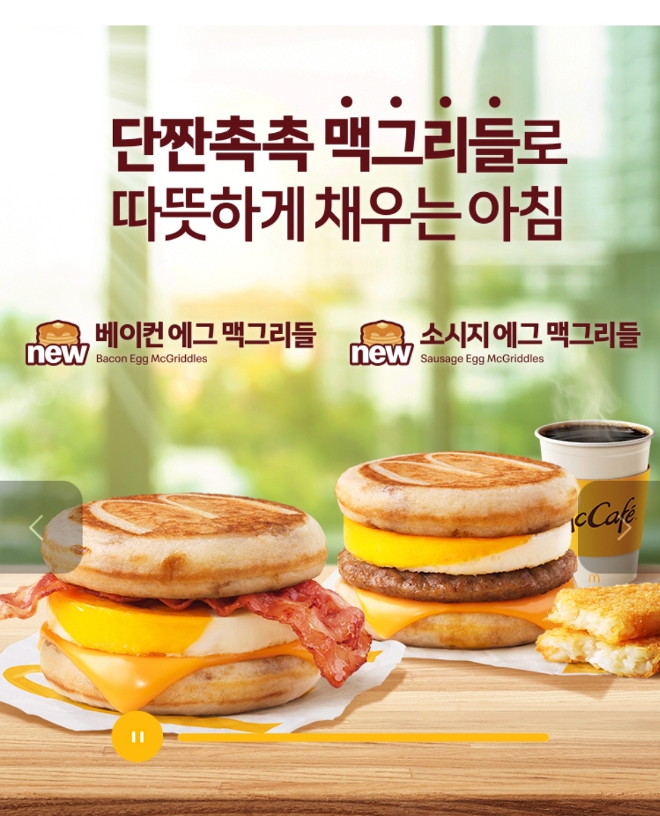 달콤한 메이플 시럽이 스며든 촉촉한 핫케이크 번과 신선한 국내산 1+ 등급 계란, 짭짤한 베이컨 또는 소시지가 어우러진 NEW 맥그리들이 출시되었습니다.