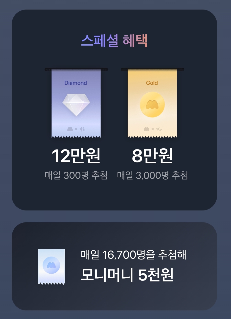매일 2만 명씩 총 20만 명을 추첨하여 선불 충전금 '모니머니'를 최대 12만 원까지 제공합니다. 당첨된 고객은 추후 통장 사전 개설 기간에 통장을 개설하면 추가 혜택을 받을 수 있습니다.