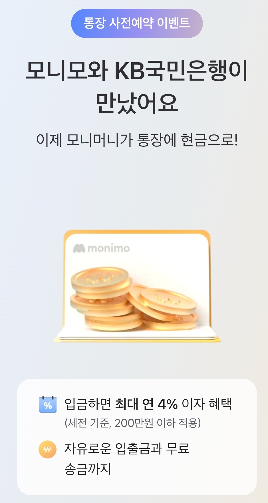 삼성금융네트웍스와 KB국민은행이 협업하여 2025년 4월 출시 예정인 '모니모 KB 매일이자 통장'의 사전 예약 이벤트를 진행하고 있습니다. 이 통장은 200만 원까지 최대 연 4%의 이자를 제공하며, 매일 이자를 받을 수 있는 것이 특징입니다.