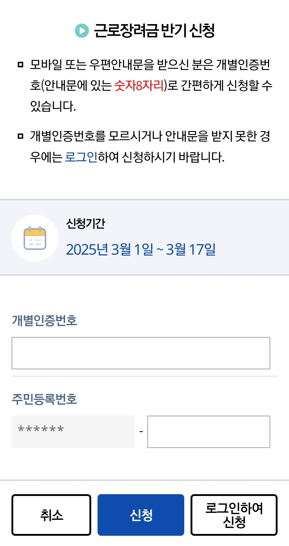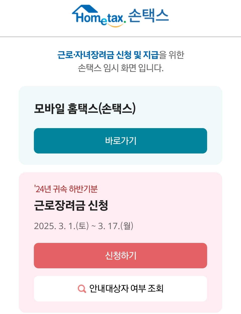 신청안내문을 받지 않은 경우: 홈택스 로그인 후 '장려금·연말정산·전자기부금 > 근로장려금 정기/반기 신청 > 직접입력신청'을 선택하여