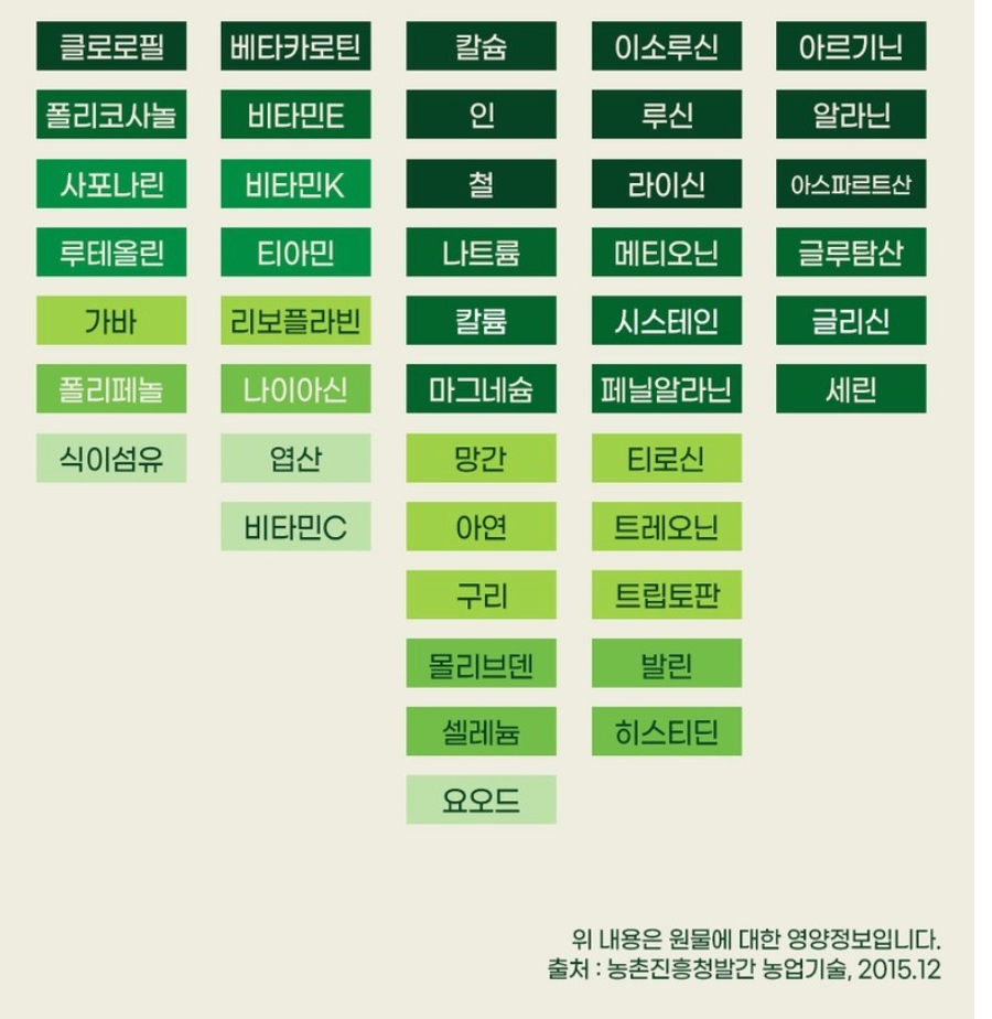 새싹보리에는 사포나린, 폴리코사놀, 폴리페놀, 루테올린 등 다양한 영양성분이 함유되어 있습니다. 또한, 미네랄 12종, 비타민 8종, 아미노산 18종 등을 포함하고 있어, 식이섬유와 미량영양소까지 고루 갖추고 있습니다.