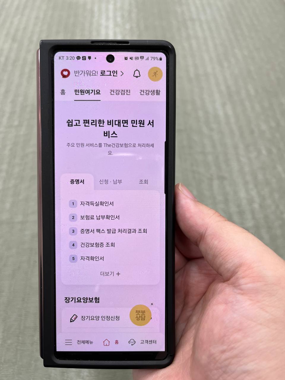 더 건강한 국민의 삶을 위해 모바일로 편리하게 민원서비스를 이용하세요. 1. 민원여기요 - 자격득실확인서, 보험료 납부확인서 등 증명서 5종을 제출기관에 팩스로 보낼 수 있습니다. - 보험