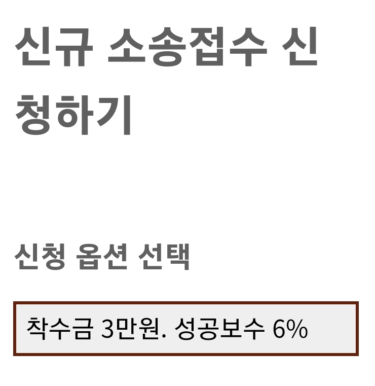 - '신규 소송 접수'에서 신규 옵션을 선택합니다. 이때 착수금은 3만원, 성공 보수는 6%입니다.