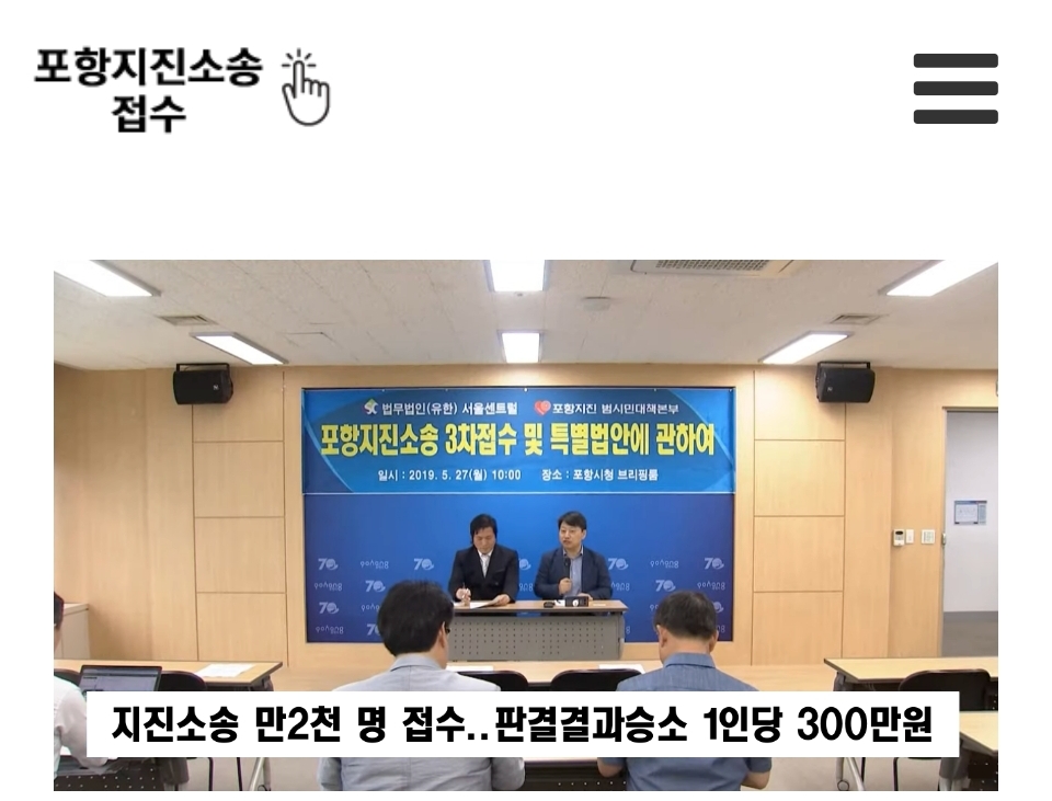 2017년 11월과 2018년 2월 포항에서 발생한 지진으로 인한 정신적 피해에 대한 국가 배상 판결에 포항시민이 승소했습니다.